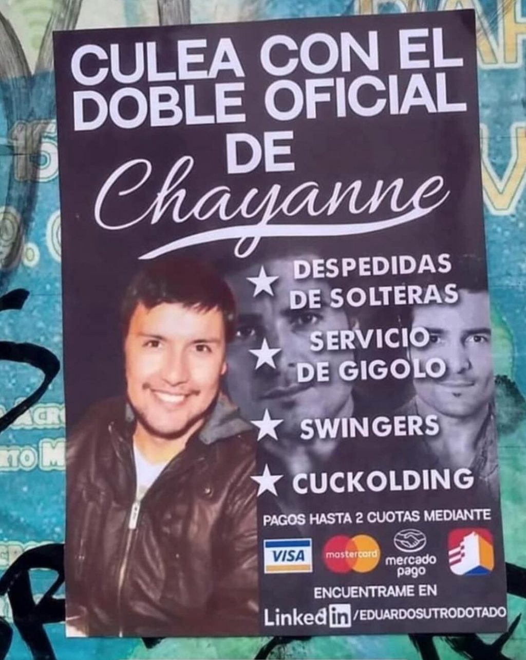 Circula en internet un folleto publicitario donde un hombre se presenta como “doble de Chayanne” y ofrece servicios de acompañamiento para eventos privados.