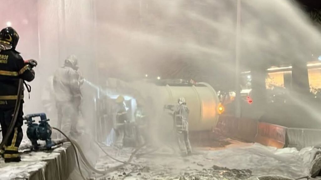 Una pipa de Pemex sufrió una volcadura sobre carriles centrales de Periférico, a la altura de Paseo de las Palmas con dirección al sur. Debido a este accidente, se registró una fuerte movilización de cuerpos de seguridad debido al derramamiento de varios litros de combustible.