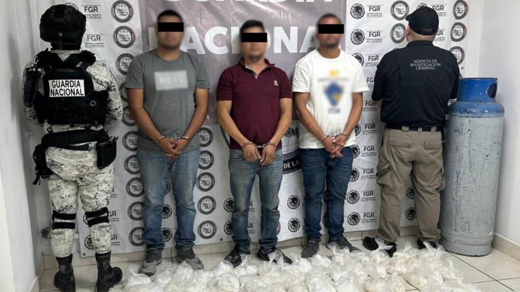“En un puesto de seguridad, detuvieron a tres personas, a quienes les aseguraron 36.2 kilos de metanfetamina ocultos dentro de un cilindro de gas con doble fondo”, detalló la SSPC.