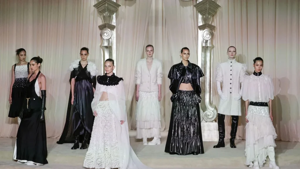 Para la temporada otoño-invierno 2025-2026, la casa francesa reinventa los clásicos del invierno y reinterpreta el emblemático tweed, que esta vez adquiere un aire de tejido en vestidos más o menos largos, abrigos largos y trajes de falda y pantalón de talla baja, adornados con lentejuelas, plumas y perlas.