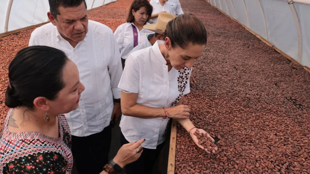 Sheinbaum muestra producción de cacao para chocolate del bienestar