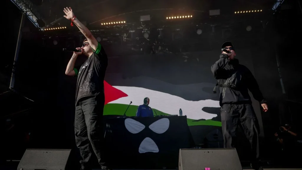 “¡Palestina libre!”, gritó al comienzo de la función el grupo, cuya música oscila entre el rap y el punk, arengando a una multitud entusiasta en la que se veían pañuelos palestinos y camisetas irlandesas, antes de añadir inmediatamente: “No estamos en contra de Israel”.