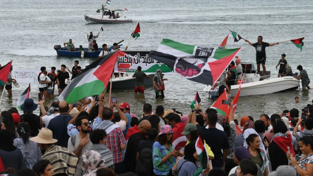 Más de un millar de personas, muchas de ellas ondeando banderas palestinas, acudieron a la playa de Sidi Bou Said para saludar a la flotilla.