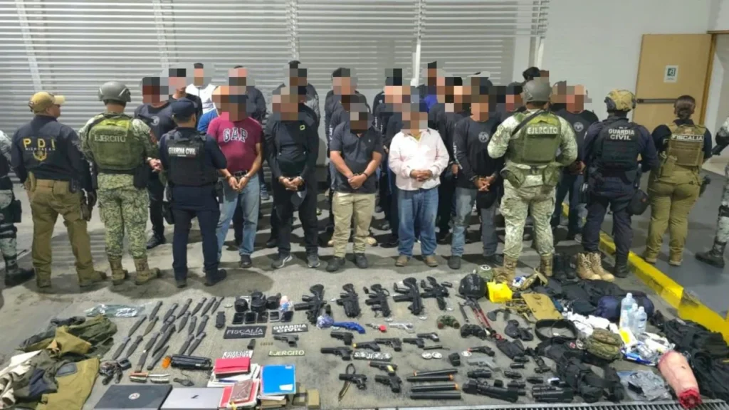 Durante la detención fueron aseguradas un arma corta, 19 réplicas de armas de fuego, armas blancas y equipo táctico, entre otros aditamentos.