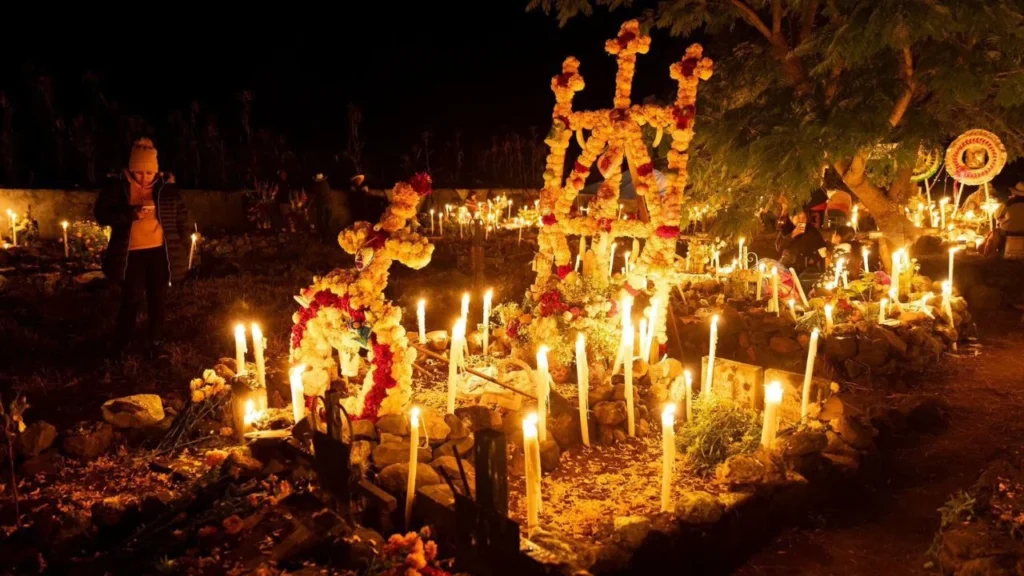 Visten las tumbas de sus difuntos con aromáticas flores de cempasúchil o esparcen sus pétalos sobre las lápidas, encienden velas para facilitar el retorno de las almas a la tierra, y sirven la comida y las bebidas favoritas de los difuntos para alimentarlos después del camino recorrido.