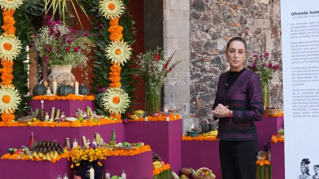 En su cuenta de X, la mandataria nacional dijo que la “ofrenda en Palacio Nacional se llena de flores, colores, canto y fuego. Cada pétalo de cempasúchil marca el camino de regreso para aquellas mujeres que sembraron vida en su paso por la tierra”.