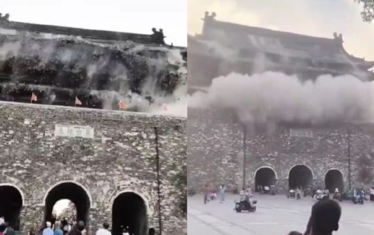 Miles de turistas presenciaron el derrumbe parcial del techo de la Torre del Tambor de Fengyang, una estructura de 650...