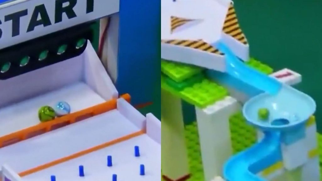 Ambas canicas, de México y Argentina, son lanzadas a la par Inicia el recorrido y la pelotita verde toma la delantera, pero en el primer agujero, la pelota azul sale primero; en el segundo, se vuelven a encontrar, pero es la canica de los sudamericanos la que sale primero.