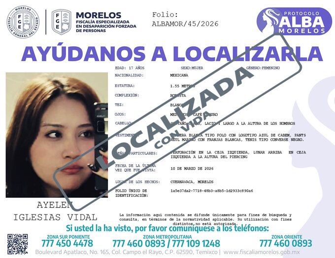 Luego de que se reportara la desaparición de Ayelen Iglesias Vidal desde el 10 de marzo de 2026 en Cuernavaca, Morelos, la FGE informó que fue encontrada con vida.