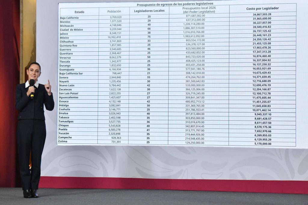 Durante su conferencia mañanera, el pasado 12 de marzo, la presidenta Claudia Sheinbaum presentó una tabla comparativa de los presupuestos de los poderes legislativos estatales para 2026. En ella se destacó un indicador que llamó la atención pública: el costo por legislador en cada entidad.