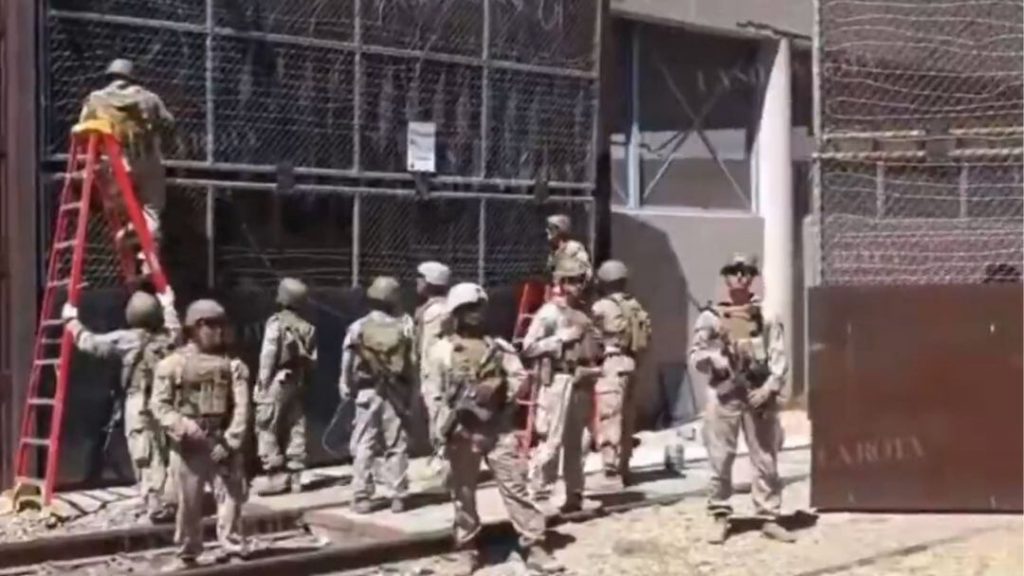 En las imágenes se observa cómo los elementos de la Guardia Nacional de Estados Unidos permanecieron cerca de una hora realizando trabajos de reparación en la puerta de acceso del tren.