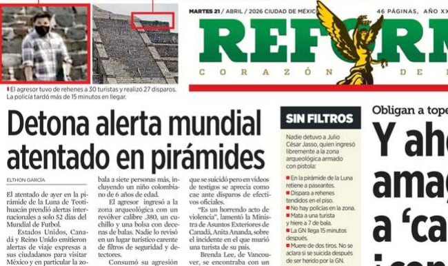 En la misma edición de este martes 21 de abril de 2026, el caricaturista de Reforma, Calderón, considera que con el tiroteo en Teotihuacán se ha llevado a la piedra de los sacrificios al Mundial de Futbol. Terrible imagen pensada evidentemente no para explicar un fenómeno psicológico y sociológico complejo, sino para dañar a México ante la proximidad del gran torneo de la FIFA que es seguido cada cuatro años por decenas y aun cientos de millones de personas de todos los países.