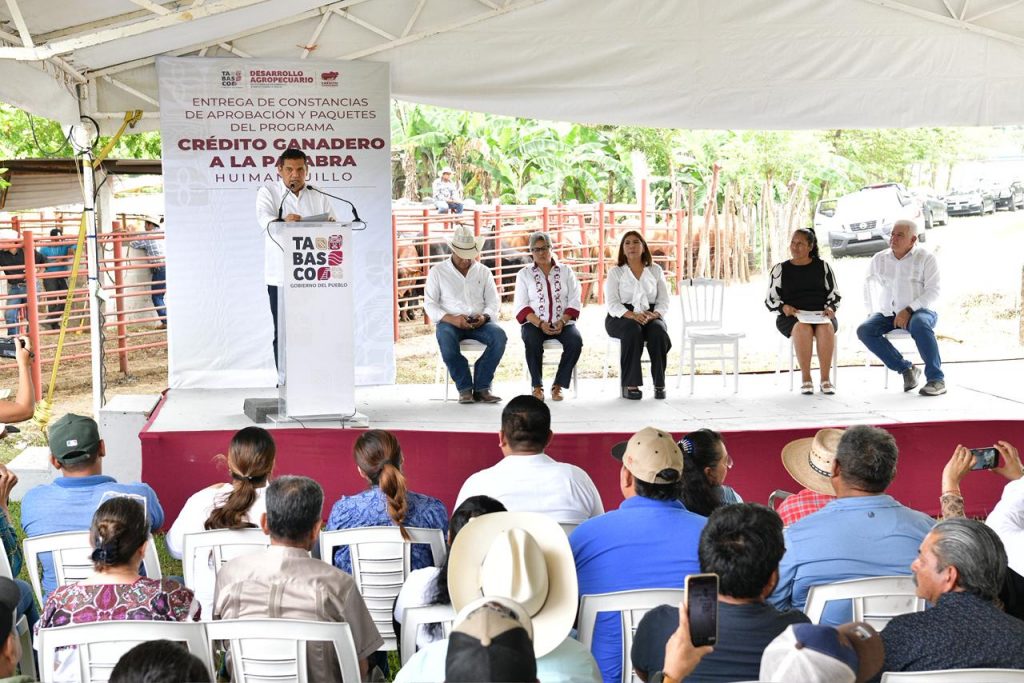 Con el objetivo de impulsar la autosuficiencia alimentaria y fortalecer la producción pecuaria, el gobernador de Tabasco, Javier May Rodríguez, encabezó la entrega de 100 paquetes del programa Crédito Ganadero a la Palabra.