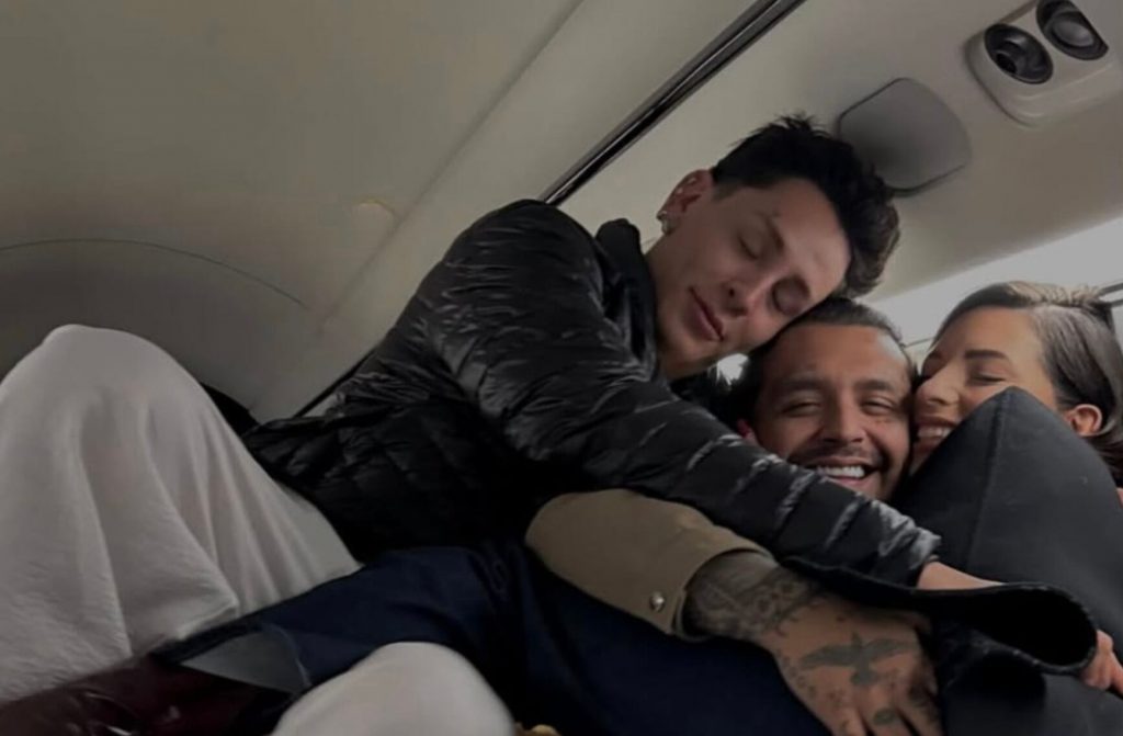 En otra foto aparece Kunno abrazando a Christian Nodal y Ángela Aguilar con la frase: “Felices los tres”.